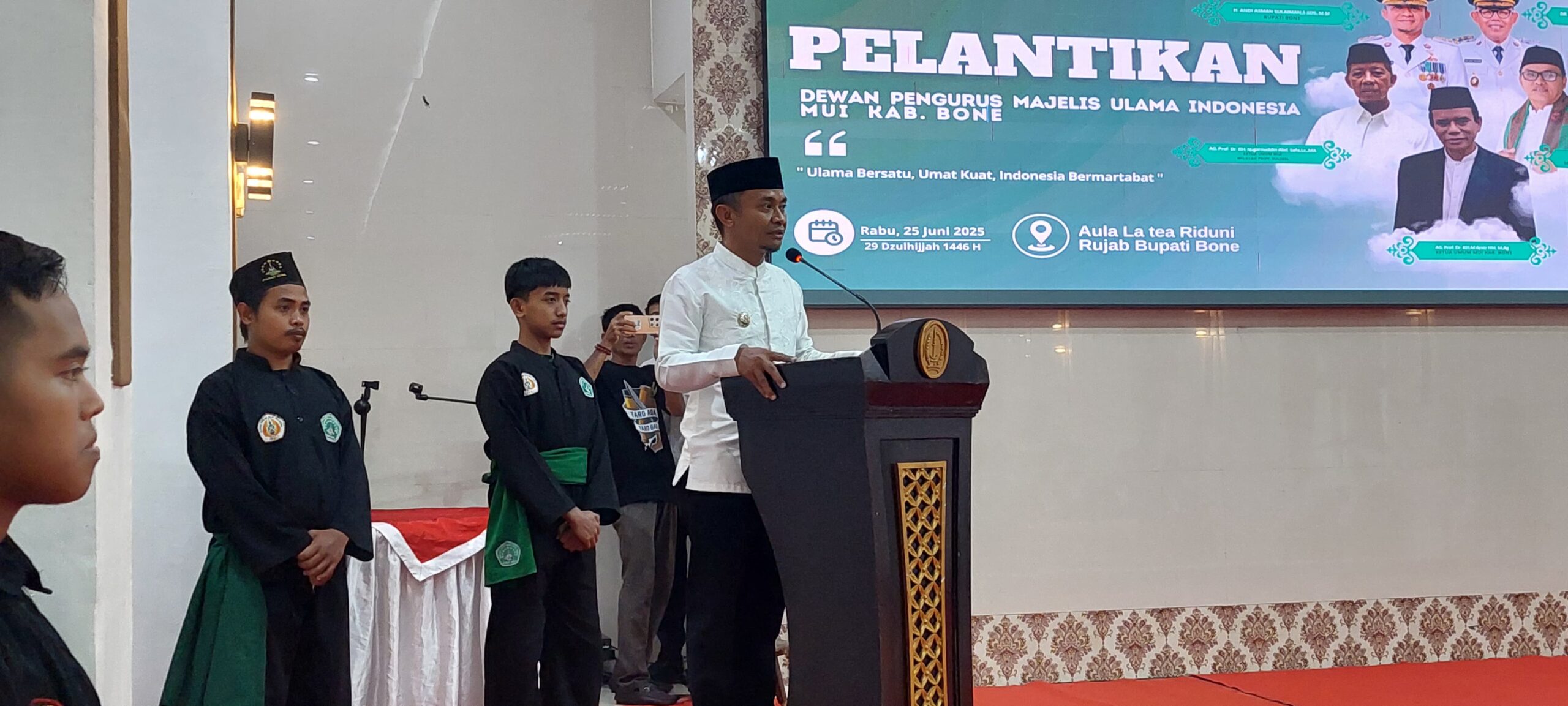 Bone, muisulsel.or.id – Bupati Bone, Andi Asman Sulaiman, S.Sos M.M, menghadiri langsung prosesi pelantikan pengurus Majelis Ulama Indonesia (MUI) Kabupaten Bone di Aula La Teya Riduni, Rumah Jabatan Bupati Bone, Rabu (25/6/2025).