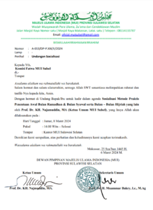 Agenda itu berbunyi Sosialisasi Metode Praktis Penentuan Awal Bulan Ramadan dan Bulan Syawal serta Bulan-bulan Hijriah yang Lain yang akan dipaparkan oleh Ketum MUI Sulsel Prof Dr KH Nadjamuddin AS, Lc MA, secara langsung dan dilaksanakan pada hari Jumat, 8 Maret 2024, pukul. 14.00 Wita, usai salat jumat.